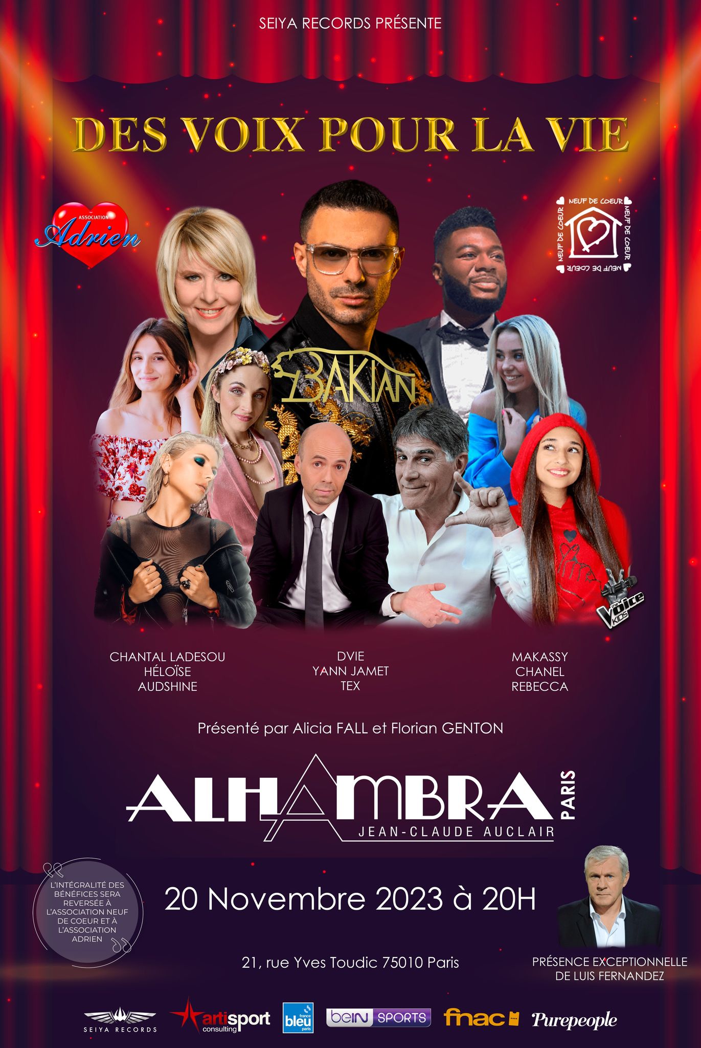 Parmi eux : Chantal Ladesou, Bakian, Rebecca, gagnante de The Voice Kids 7, Makassy, Tex, Audshine, Héloïse de N’oubliez pas les paroles sur France 2, Dvie, Chanel, Miss Jeunesse France 2023, Yann Jamet et bien d’autres, ainsi que des invités d’exceptions comme Luis Fernandez, légende du football français. L’intégralité des bénéfices sera reversée à l’Association Neuf de Coeur fondée par Jean-Pierre Papin, Ballon d’Or 1991 et son épouse, qui vient en aide aux familles d’enfants atteints de lésions cérébrales, et à l’Association Adrien, créée par René Molines à la suite du décès de son fils Adrien, qui œuvre au quotidien pour les enfants malades et leur famille.