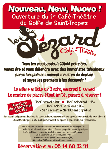 Hé bien, j’ai très envie de conseiller à vos lecteurs d’aller aux spectacles des arts du rire une fois par mois dans les différents espaces culturels qui nous accueillent et au moins une fois par semaine au lézard, le nouveau café-théâtre du golfe de St-Tropez parce que RIRE est bon pour la santé !